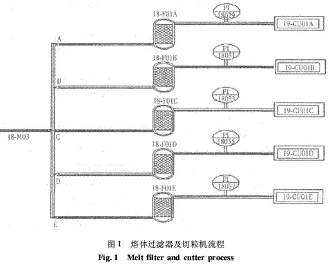 1熔體過濾器后管道壓力和流量的關(guān)系我公司新建的PET裝置,終聚釜的熔體經(jīng)過瑪格泵輸送后,通過電動六通閥18M03,再經(jīng)過5臺單獨的熔體過濾器,分別送到5臺切粒機(jī)切粒,流程見圖1。